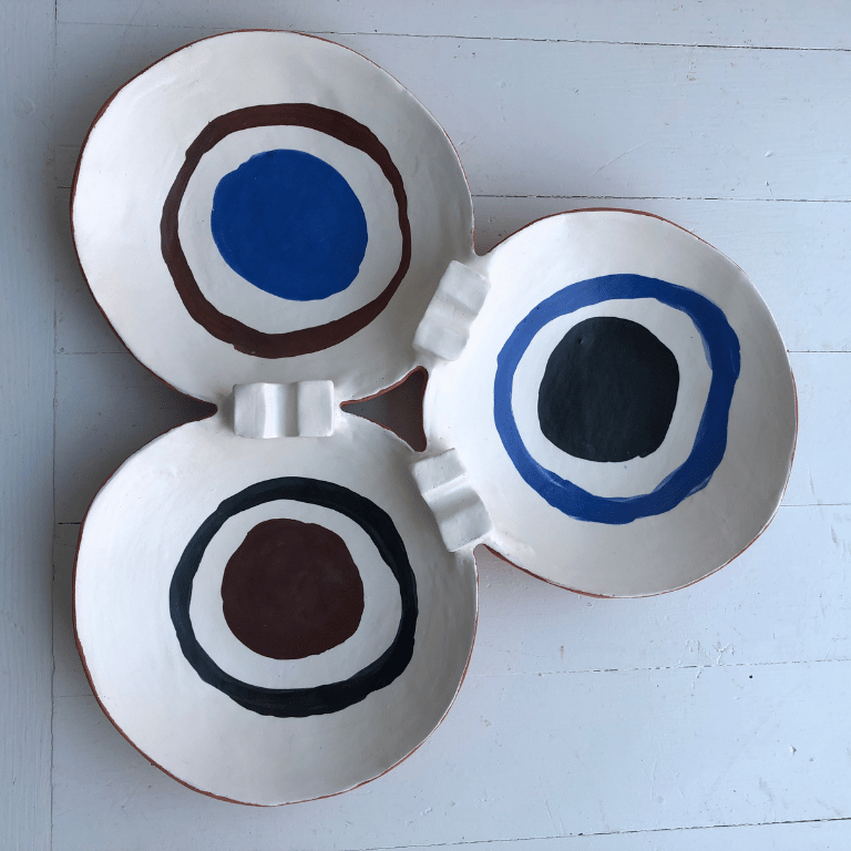 3 in one ashtray is perfect for pot conoisseurs or for organizing little what nots, rings, bobby pins, etc. yet so beautiful as a piece of unique pottery that you may love it too much to put anything in it. Designed especially for Bartsch Bazaar by celebrated ceramics creator Paula Greif, signed PAULA, a versatile and thoughtful gift to commemorate any occasion.