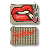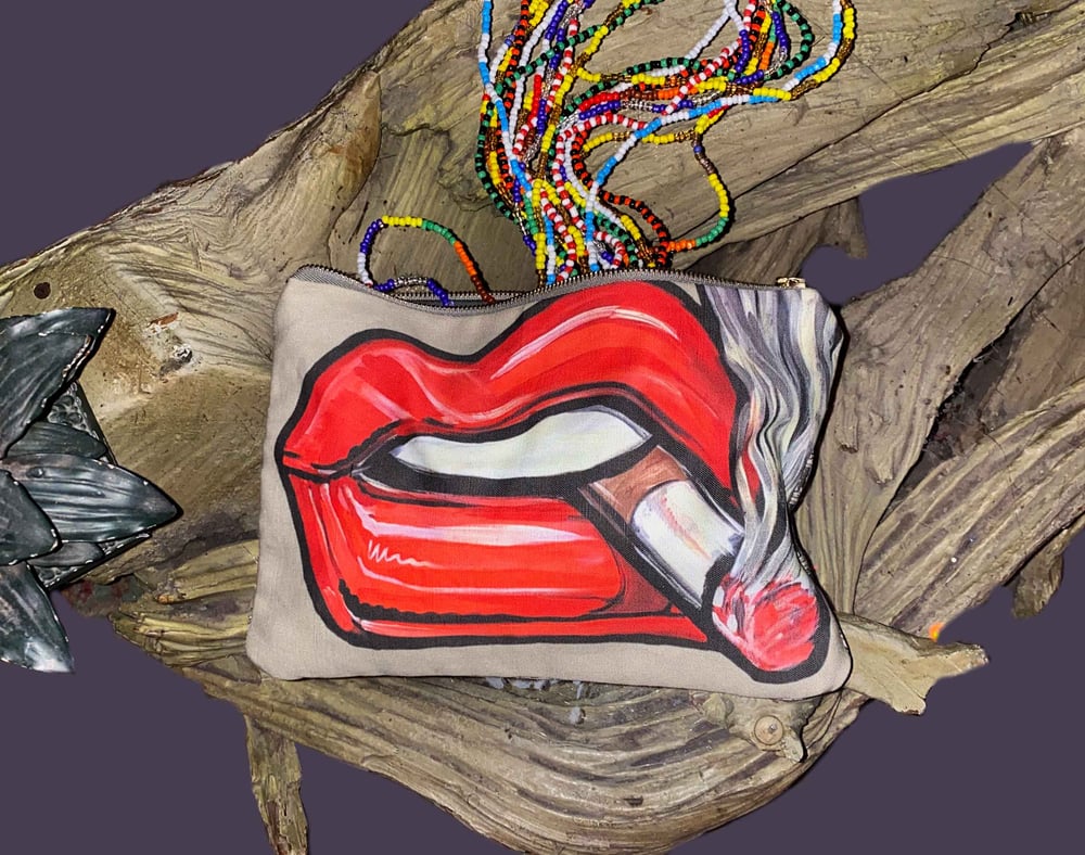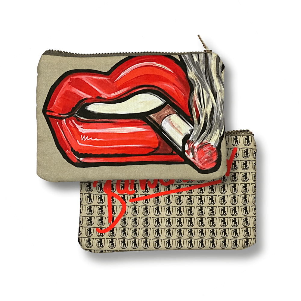 Lip Zip Clutch: multi-use zipper clutch for chargers, phones, compacts and what-nots. Printed on front with Martine smoking lips, printed on back with Bartschland signature logo on repeating crest pattern.