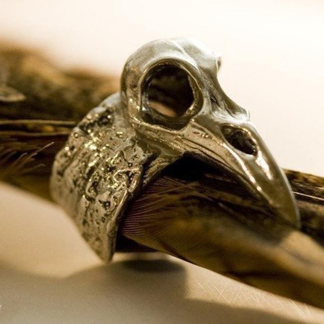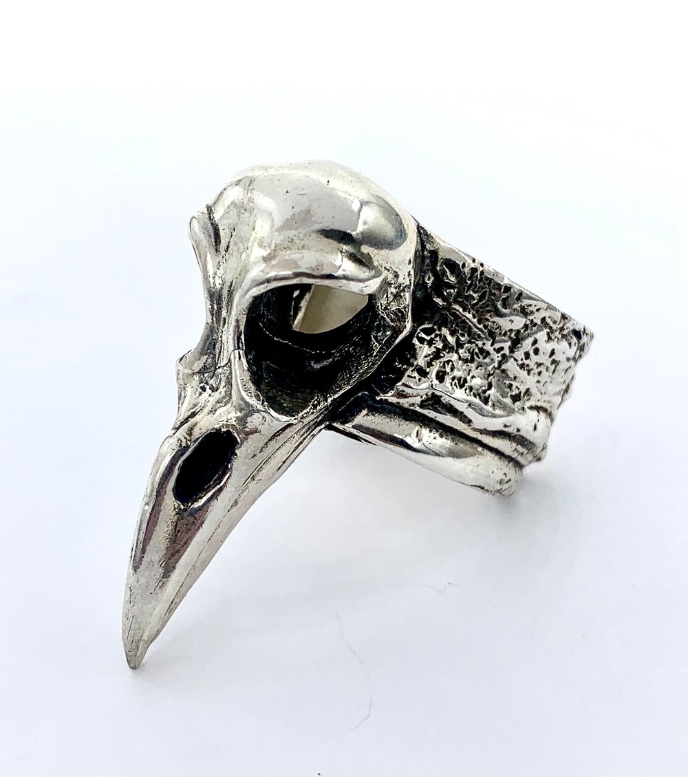 Ravens' symbolize wisdom, affection, healing powers, longevity, death, and fertility. This sterling silver ring is cast on a persimmon tree bark ring band to lift your spirit and style while heading out for a wild night, or night trip for scones.
